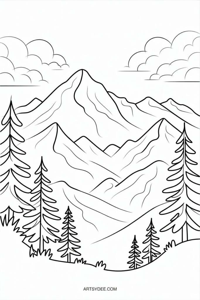 Layered mountain ranges with misty atmospherics look incredible in pencil. Play with values — darker peaks in front, lighter ones receding into the distance. Add some pine trees for scale and interest.