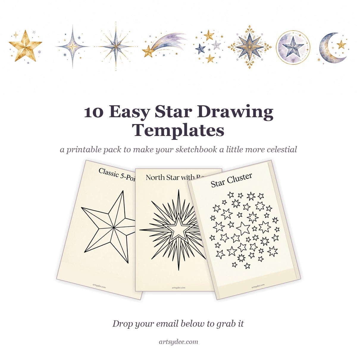 I’ve put together a free pack of 10 traceable star templates — the classic 5-point star, a 4-point sparkle star, a north star with rays, a shooting star with a trail, a small star cluster, an ornate decorative star, a friendly cartoon star, a constellation, a star inside a mandala circle, and a soft star-with-moon-and-clouds scene. Trace them, watercolour over them, or use them as warm-ups when your sketchbook feels intimidating.